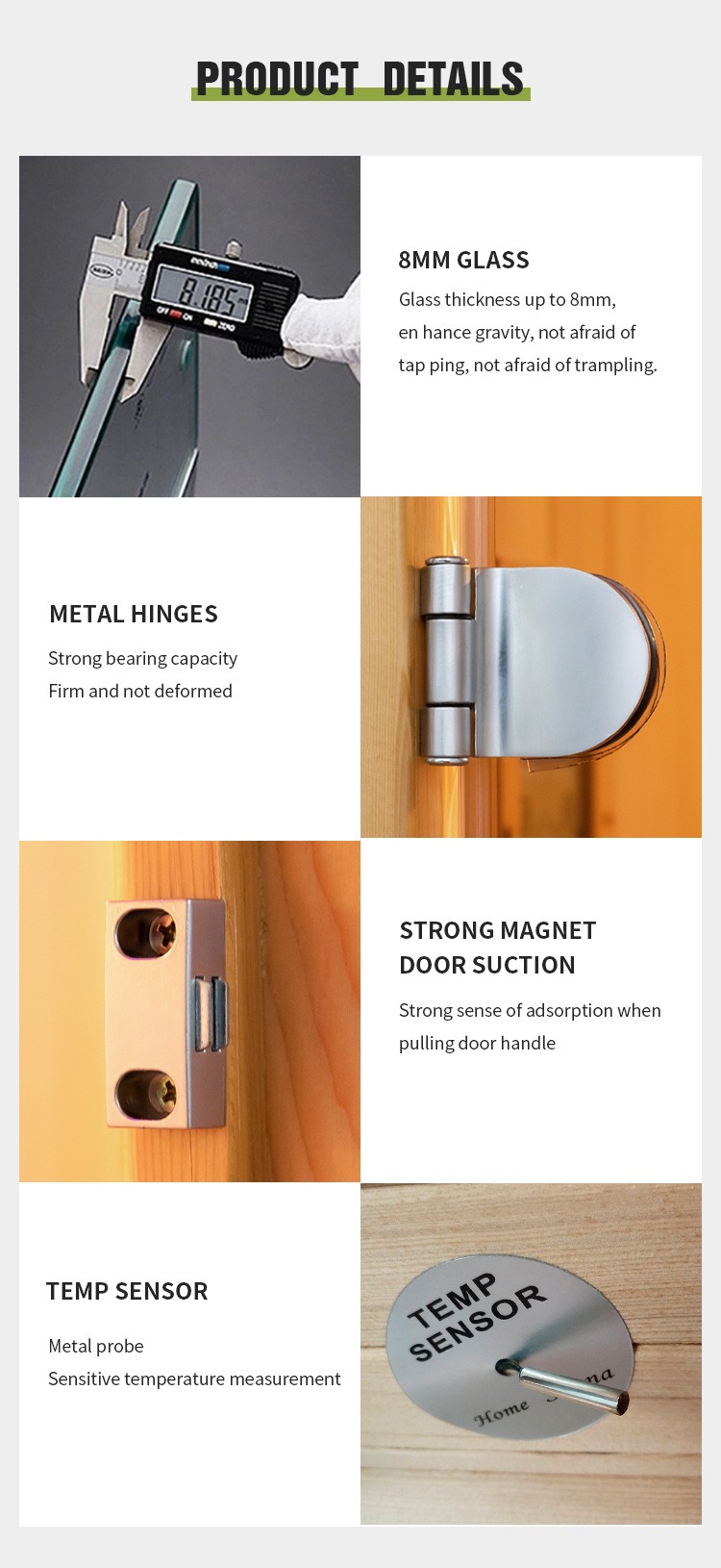 • شیشه 8 میلی متری سکوریت: همانطور که در جزئیات محصول نشان داده شده است، اتاق مادون قرمز و سونای بخار چوبی 1-3 نفره دارای شیشه سکوریت شده با ضخامت 8 میلی متر است. دوام فوق العاده ای دارد و مقاومت گرانشی را افزایش می دهد. لازم نیست نگران ضربه زدن یا لگدمال کردن آن باشید – این دستگاه برای مقاومت در برابر استفاده روزانه ساخته شده است.