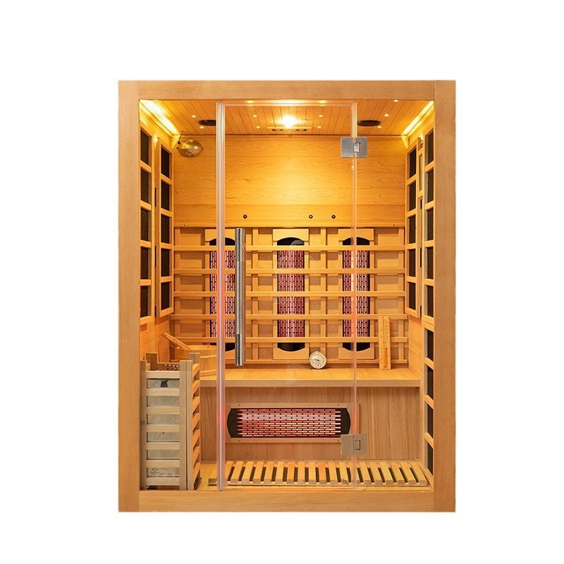 اتاق سونای مادون قرمز و بخار چوبی 1 تا 3 نفره دارای ویژگی های پیشرفته ای است که سفر سلامتی شما را بهبود می بخشد: بخاری های مادون قرمز و صفحات گرمایش گرافن مادون قرمز (گرمای یکنواخت و کارآمد برای عرق کردن عمیق و آرامش بخش فراهم می کند). یونیزر اکسیژن (هوای داخل سونا را تصفیه می کند و فضایی تازه و نشاط آور ایجاد می کند). Reading Light & Speaker (به شما این امکان را می دهد که در حین لذت بردن از جلسه سونا، موسیقی بخوانید یا گوش دهید). کنترل پنل (تنظیم آسان دما، زمان و سایر تنظیمات را برای تجربه شخصی امکان پذیر می کند). اجاق سونا و لوله موج سبک (برای تولید بخار و گرمای مادون قرمز با هم کار می کنند و برای دوستداران سونای بخار و مادون قرمز دور آماده می شوند).