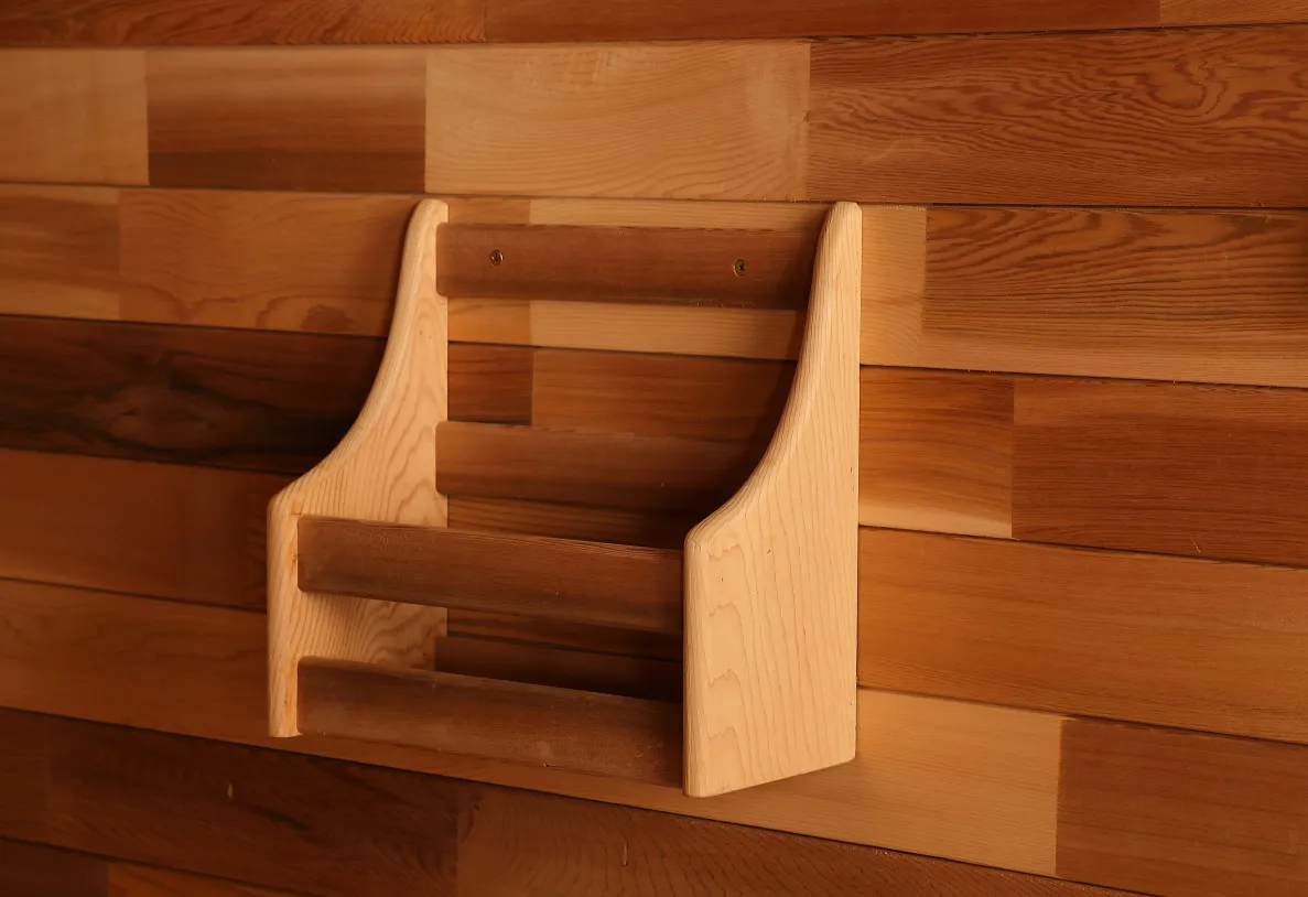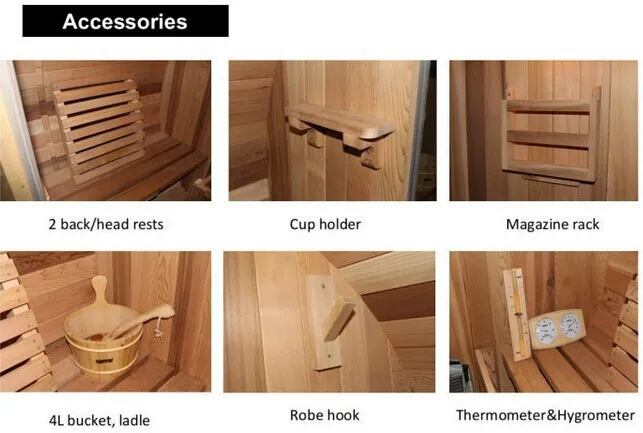 • لوازم جانبی راحت: جا لیوانی، قفسه مجله، رخت آویز داخلی (برای نگهداری لباس و حوله به طور معمولی، از بین بردن بهم ریختگی در طول جلسات سونا).