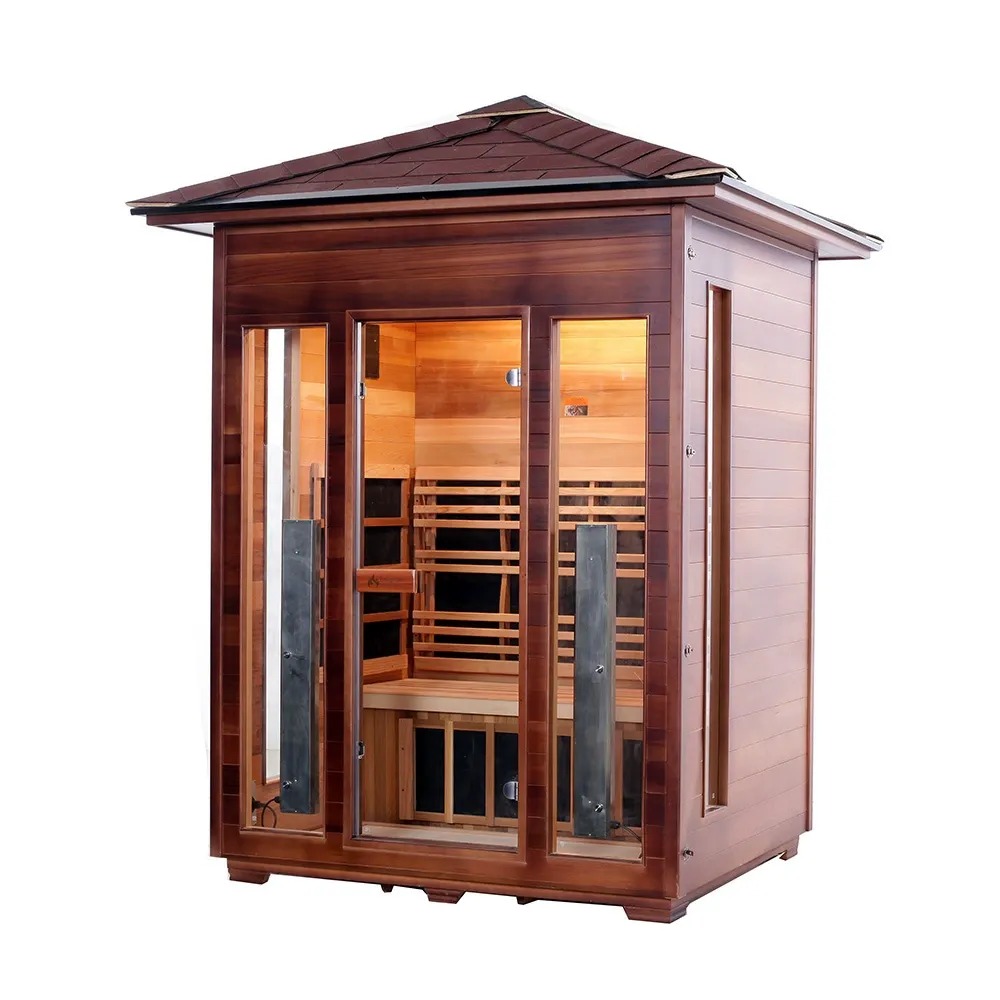 Crafted from Canadian Western Red Cedar or Hemlock, the Red Cedar Outdoor Far-Infrared Sauna boasts natural corrosion resistance, moisture resistance, and structural stability. Its inherent woody fragrance soothes the mind, while its elegant texture complements high-end courtyard architectural styles. At its core, the sauna features a far-infrared carbon fiber or graphite crystal heating system, enabling rapid heating, uniform heat distribution, energy efficiency, and deep thermal penetration—effectively promoting blood circulation, relieving muscle fatigue, and ensuring a long service life.
